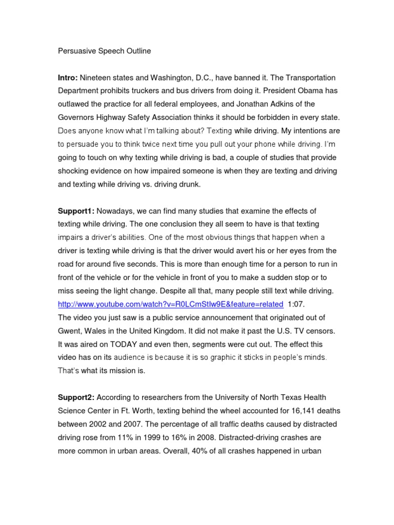 There is the need for a nationwide ban on texting driving as recommended by the National Transportation Safety Board. Laws were banning texting while driving will save many lives in America. With the new trend of texting close to 5, deaths and numerous injuries have been caused by distracted drivers. It is imperative that the government should texting while driving persuasive essay stricter action to minimize the increasing death caused by texting while driving persuasive essay drivers.